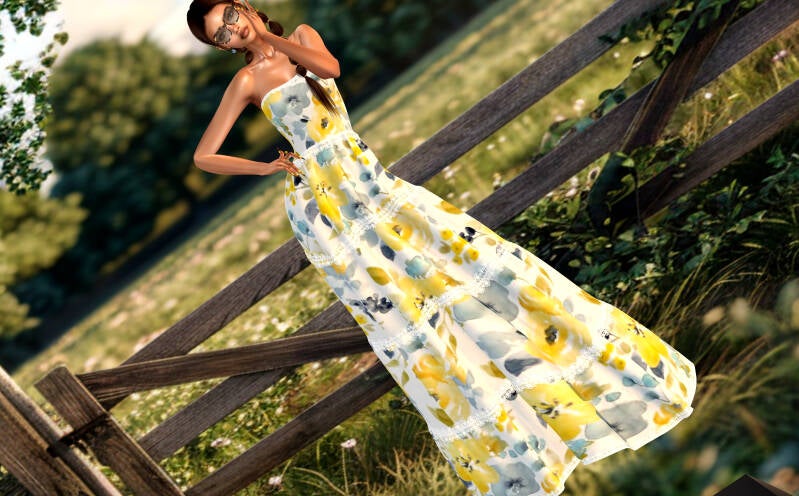 This long strapless dress enchants with a watercolor floral print in shades of yellow and blue. The lightweight fabric flows gracefully, while lace bands add a romantic touch. Perfect for summer strolls and afternoons in the countryside, a fresh look that celebrates natural femininity.