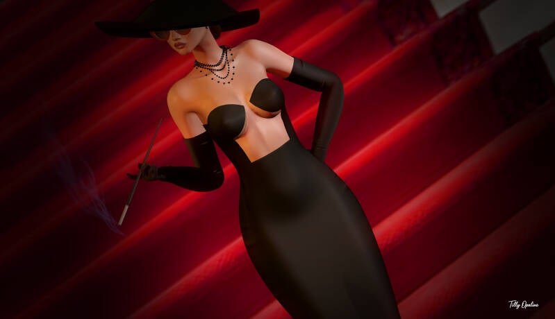 An outfit that embodies pure elegance and mystery. The sleek black dress, bold and sculpted, plays with strategic cutouts that highlight femininity with refined provocation. The long satin gloves add a touch of drama and class, while the wide-brimmed hat completes the look with old-Hollywood allure. A sophisticated, magnetic ensemble infused with modern seduction.