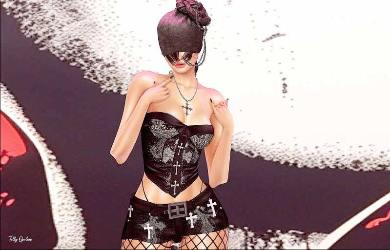 A bold and provocative look where black reigns with sensuality. The glossy corset sculpts the figure, embellished with silver details and gothic crosses. The matching mini skirt, short and alluring, enhances the legs wrapped in fishnet stockings with a rebellious charm. The barely visible panties add a playful touch, while the shoes — high and assertive — complete an outfit that blends mystery, strength, and seduction in a perfect dark-chic balance.