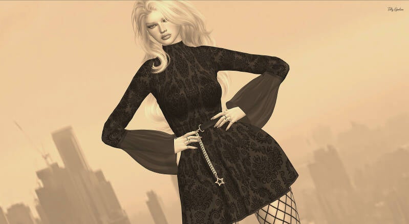 DEENA by AXE is an outfit that sculpts the silhouette and commands attention: the figure-hugging dress with flowing sleeves meets a statement belt, matching panties, boots, and fishnet stockings for a flawless balance of strength and sensuality.