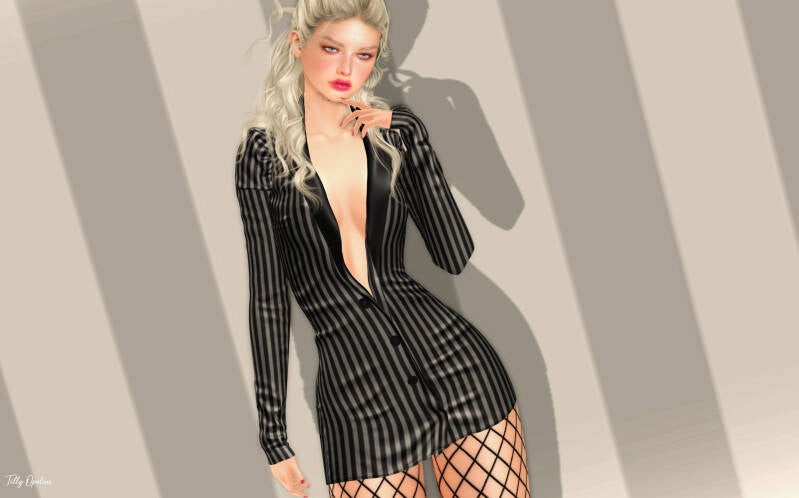 Xarias by AXE is the perfect outfit for those who love a style that is both powerful and sophisticated. The striped blazer dress sculpts the silhouette with clean, confident lines, creating a striking balance between femininity and attitude. Its deep neckline and mini length add a daring touch, while the fishnet stockings and boots complete the look with a fierce, irresistible edge.